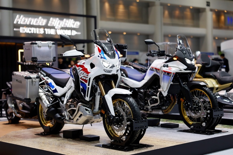 ตามมาด้วยไลน์อัปรถจักรยานยนต์สายแอดเวนเจอร์ นำโดย New Honda CRF1100L Africa Twin ภายใต้คอนเซปต์ ‘True Adventure Never End การผจญภัยที่แท้จริง ลุยได้ไม่มีวันจบ’ และ New Honda XL750 TRANSALP ภายใต้คอนเซปต์ ‘Mountains Are Calling เมื่อจุดพีกเรียกหา…ได้เวลาสัญชาตญาณลุย’ สองโมเดลที่ผสานสมรรถนะและความคล่องตัวสำหรับผู้รักการผจญภัยอย่างแท้จริง โดย New Honda CRF1100L Africa Twin DCT โดดเด่นด้วยสีใหม่ PEARL GLARE WHITE ผสานลายกราฟิกไตรคัลเลอร์ใหม่ให้ความ Aggressive Rally มากขึ้น มาพร้อมเครื่องยนต์ Parallel Twin พร้อมล้อหน้าใหม่ขนาด 19 นิ้ว และ New Honda CRF1100L Africa Twin MT สีใหม่ GRAND PRIX RED มาพร้อมยางแบบ Tubeless ใหม่ อวดความเป็นเอ็นดูโร่ตัวจริง ขณะที่ New Honda XL750 TRANSALP มาพร้อม New LED Headlight ดีไซน์ไฟหน้า LED ใหม่ที่รวมไฟสูงและไฟต่ำในชุดเดียว ช่วงล่างเซ็ตอัปใหม่ รับแรงกระแทกได้ดีขึ้น เครื่องยนต์ Parallel Twin 755 ซีซี 8 วาล์ว น้ำหนักรวมเพียง 210 กก. พร้อมล้อหน้า 21 นิ้ว ล้อหลัง 18 นิ้ว และระบบ ABS ที่เปิด–ปิดได้